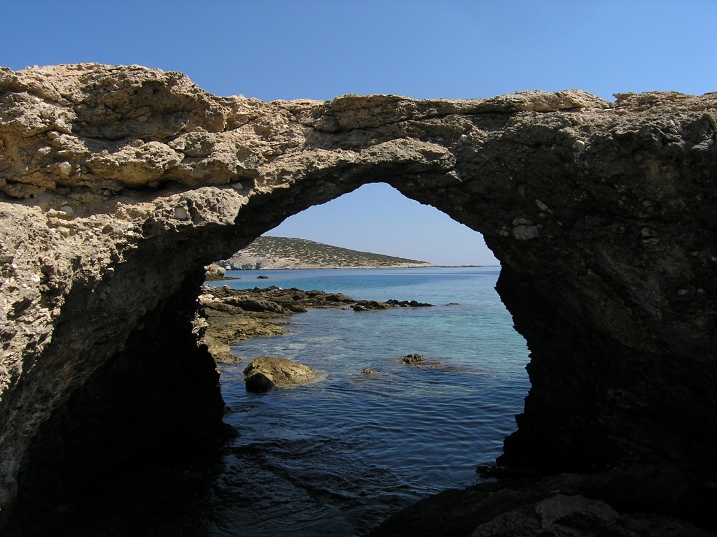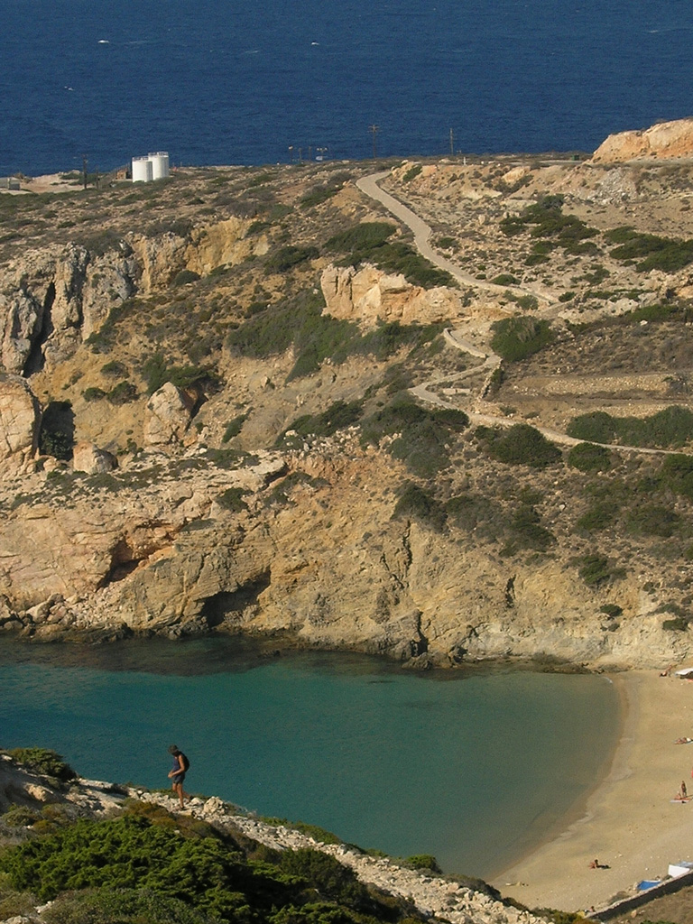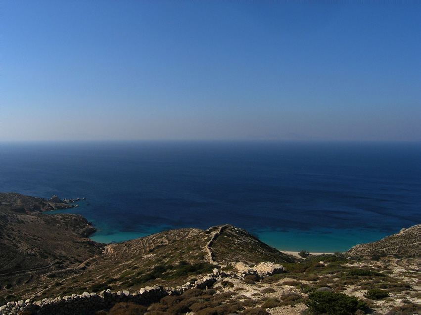 The wide embrace of Livadhi bay, the next golden-sanded beach we encounter moving coast-to-coast, certainly deserves a pause to marvel at, or swim in, if the weather permits. We continue on a westbound route up on the hill and then down again, to Vathi Limenari cape for a rambling exploration of the ‘out-of-this-world’ rocky landscape where Neolithic settlement remains were discovered. Our next stop is the stone relic of the age-old Lower Windmill (‘Kato Mylos’), with superb views to the open sea below. Continuing on narrow, rugged trail along the rocky coast overlooking small bays and inlets, we find ourselves walking above Kedros, the biggest sandy beach on the island. The turquoise-blue waters and the beach, as well as the tropical-style, low-key beach bar there, definitely merit a short or longer stop.