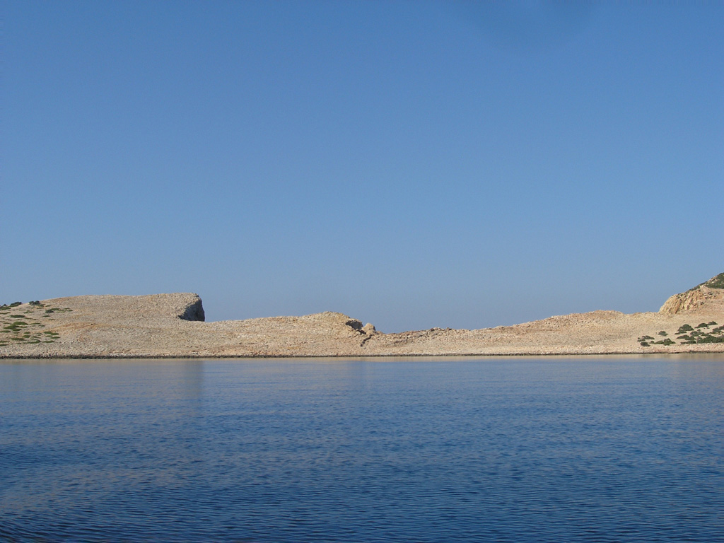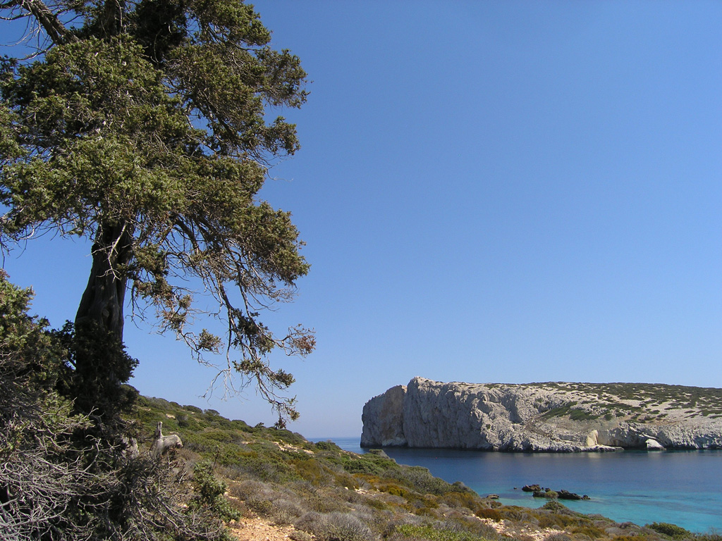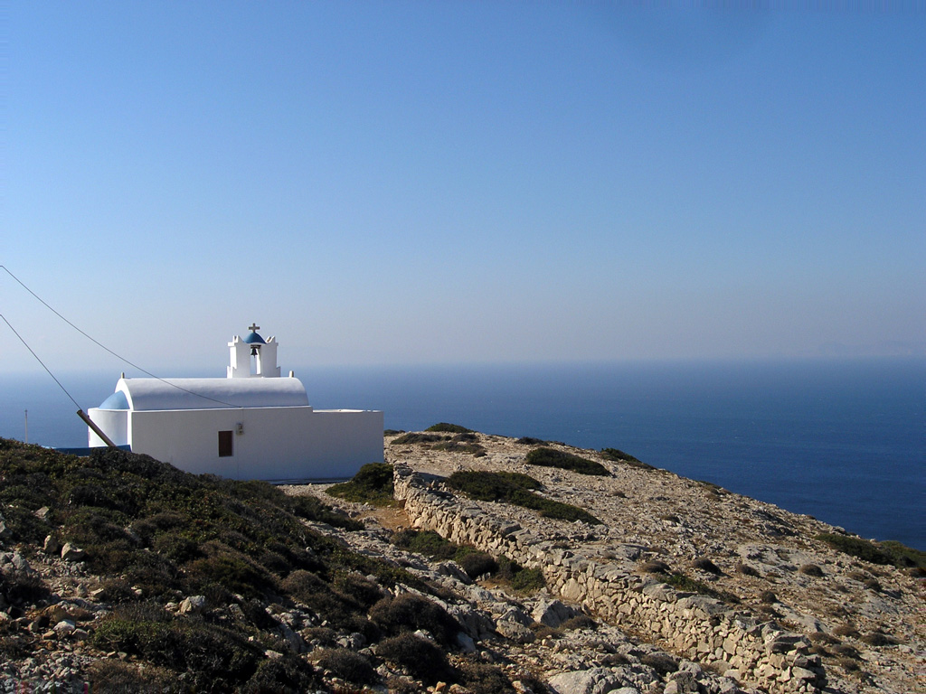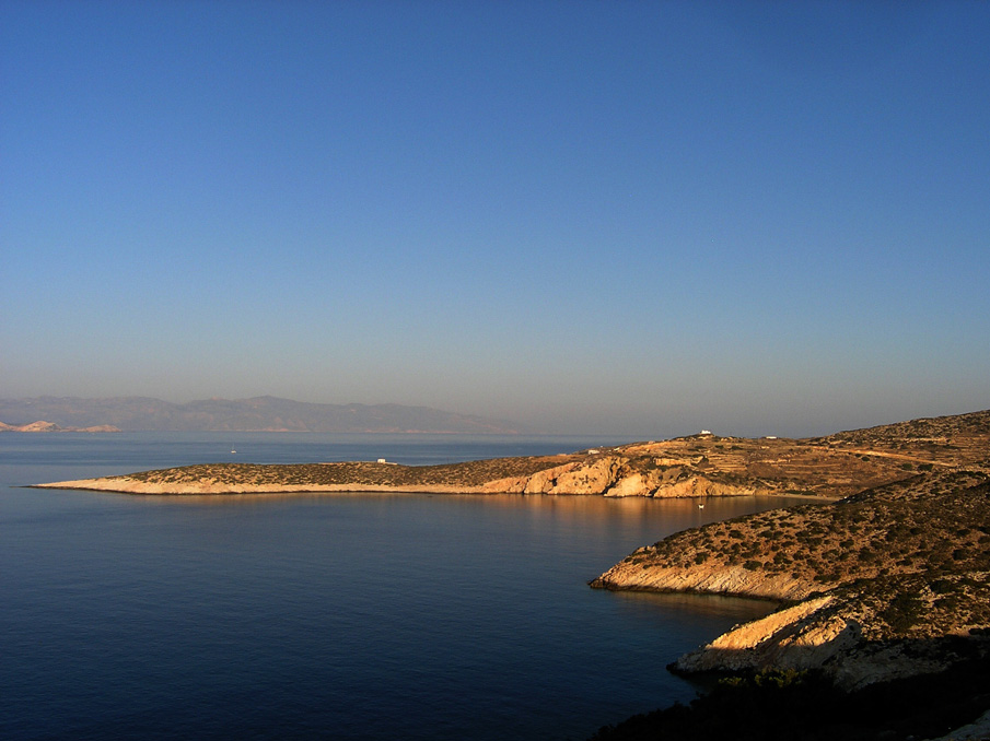 In the morning, after a good breakfast and packing some light lunch, we start out from Stavros village, going past the church of the Exaltation of the Holy Cross, after which the little capital took its name. Leaving the whitewashed, cube-like village houses behind, we start on an uphill unmarked trail which takes us to the heights of Kapsala hill after approx. 3 km. The path here goes over cliffs and is very craggy in places, so careful footing is required. The terrain difficulty however, is offset by the impression of the rocky, arid but strangely appealing landscape, with only a few juniper and lentisc (mastic) shrubs to obstruct the majestic views to the coastline and the beaches down south and southwest. Especially on top of Vardia hill (386 m), the panoramic views over the cliffs to the N-NE to Kalotaritissa bay and Skoulonisi island and the open sea beyond, are breathtaking.