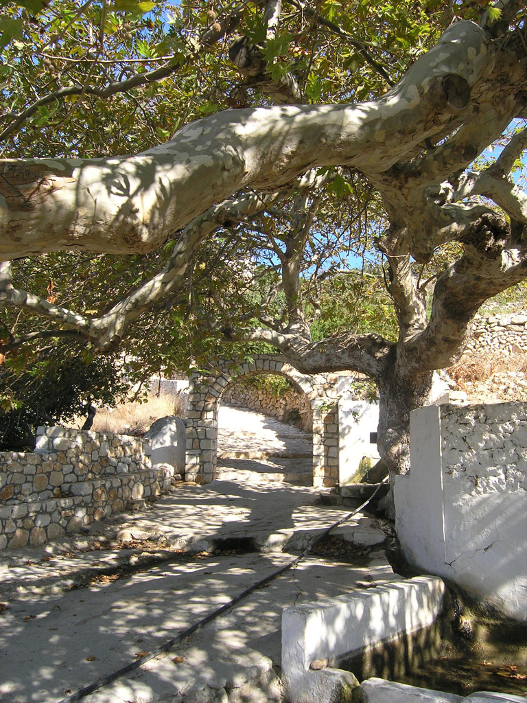 After the downhill but equally rocky footpath, we find ourselves in Mersini, a small hillside settlement, and continue to the secluded chapel of Aghia Sophia, pausing for a minute to take in the great sea views and the stark beauty of the landscape. Near the chapel, a surprise awaits: A shady, terraced spring under a huge centrury-old plane tree (or sycamore to the Americans), surrounded by green hillside fields and orchards with fig trees, almond trees, plum trees, pear trees, apricot trees and peach trees, as well as peppermint, vines, honeysuckle and rose bushes. After a bite and a break there or at a nearby taverna, we start on the downhill, rocky footpath to Fikio beach below, with its iridescent, turquoise-blue waters that seem to beckon us as we approach.