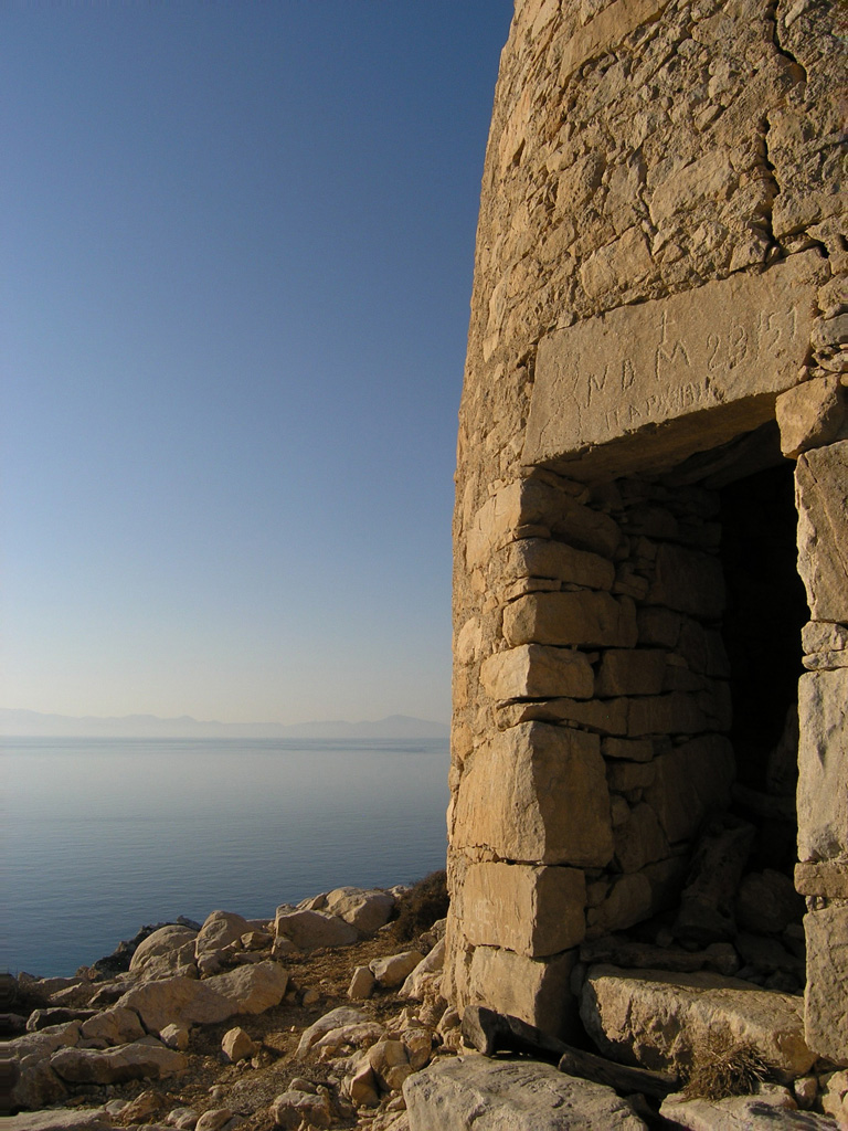 Passing by the old stone mines, we make a west detour to go uphill, until we reach the peak of Mt. Papas (385 m), the highest point on the island together with neighboring Vardia hill. There, we take a break to admire the marvelous panoramic views all over the island and over the sea, to Ikaria, Samos and the rest of the Cyclades islands. Then, it is all the way downhill, on a rough shepherd’s footpath at the ridge between Vardia and Papas hills, with beautiful views of the bay below east, until we find ourselves just above the water at Roussa bay, walking towards Kalotaritissa village, surrounded by the stark beauty of the rocky coastal landscapes of the cape and Skoulonissi islet. In summertime, a dip in the emerald waters is more than refreshing!